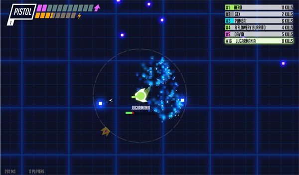 Gunr.io sigue la misma mecánica de juego que Diep.io (jugar aquí) y que lo convirtió en un éxito: en un universo en 2D, naves espaciales triangulares se enfrentan en un combate por la supervivencia. En este juego MMO (Multijugador Masivo Online) dispara con tu cañón laser a los otros contrincantes y escala posiciones en la Leaderboard con jugadores de todo el mundo en tiempo real... ¡esto es una lucha por sobrevivir!